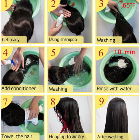 - Then put the wig in warm water (about 68℉is better, not more than 77℉) soak for 5-10 minutes. The time don'tbe too long, avoid prolonged soaking, and avoid using high temperature hot water for cleaning. Because excessive water temperature will easily damage the original textures and style of the hair, cause the hair to shed and reduce the life of the wig. After all, the hair material of high-end wigs is real human hair, not those synthetic or animal hair.